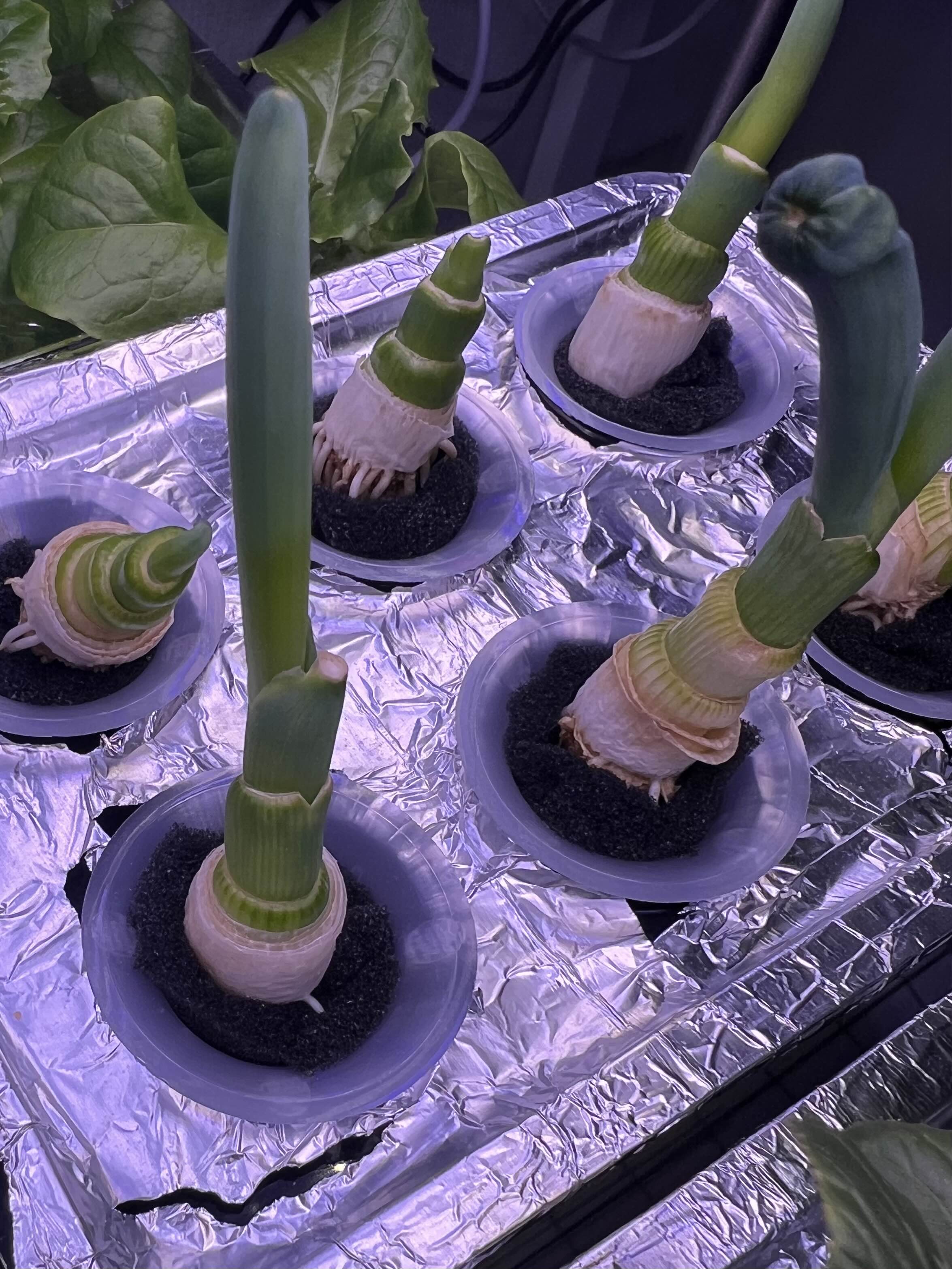 파 한단더 뿌리를 잘라서 손질해두고 다시 수경재배를 했다, 총 두단의 파.